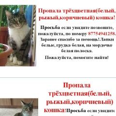 Актау (Шевченко) Пропала кошка трехцветный(белая полоска на мордочке)