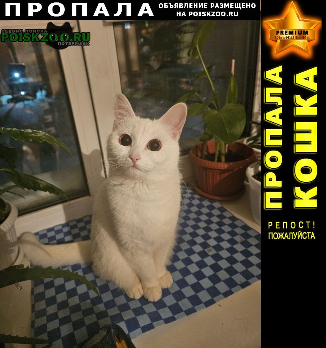 Пропала Кошка белого цвета, с розовым носиком и ушками, гладкошерстная, с жёлтыми глазами, полностью глухая.