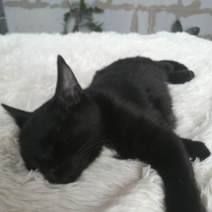 Чёрный кот с острыми ушками, белой грудкой и белым пятном на животе между лап, убежал их дома и не вернулся