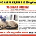 УБЕЖАЛА КОШКА НАШЕДШЕМУ ВОЗНАГРАЖДЕНИЕ 10 000 РУБЛЕЙ 22 сентября около дома 16к1 на 4-й вятском переулке ( Москва, метро Савёловская/Дмитровская) рядом магазин Красное Белое/ ветклиника Корги/ магазин Малина Метис..