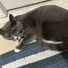 Найден молодой кот серого цвета с белым. Не кастрирован. Небольшого размера, беспородный